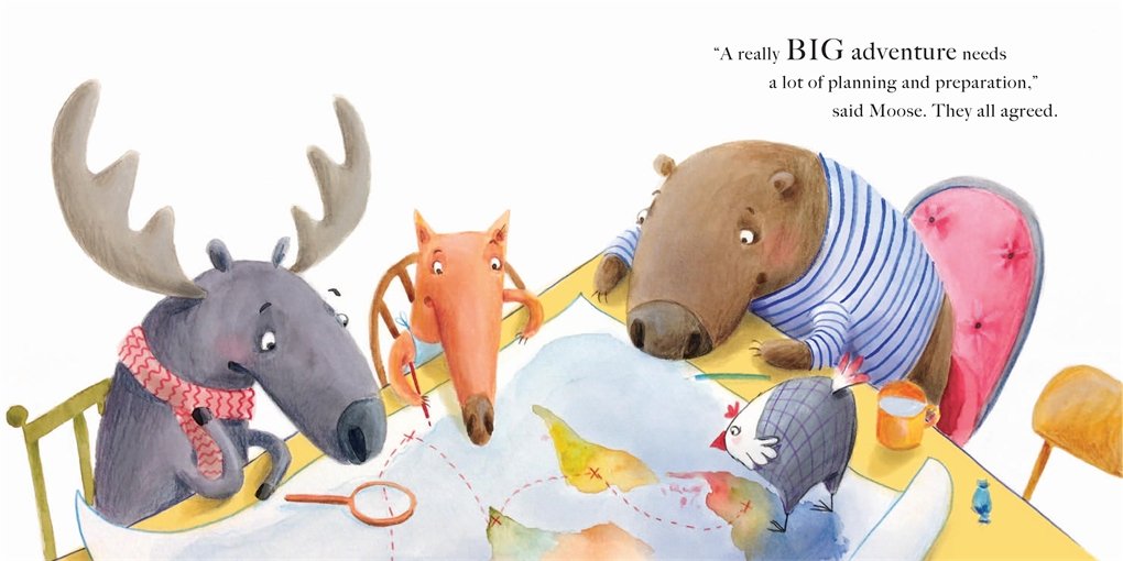Fox, Bear and Moose want to have a really BIG adventure and travel to Africa, or to the North Pole, or even to the Moon! But big adventures need a lot of planning, and can be quite scary. Luckily, their friend Chicken has a different kind of adventure in mind.