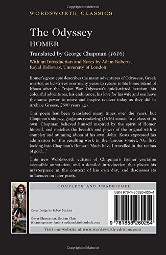 This poem has been translated many times over the years, but Chapman's sinewy, gorgeous rendering (1616) stands in a class of its own. Chapman believed himself inspired by the spirit of Homer himself, and matches the breadth and power of the original with a complex and stunning idiom of his own. John Keats expressed his admiration for the resulting work in the famous sonnet, 'On first looking into Chapman's Homer': 'Much have I travelled in the realms of gold...