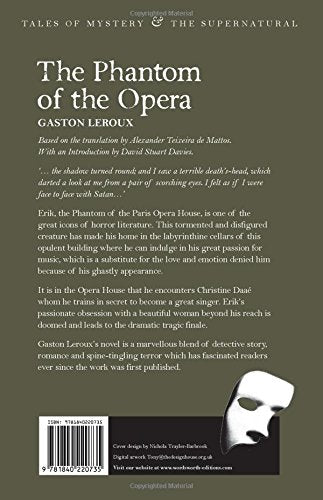Erik, the Phantom of the Paris Opera House, is one of the great icons of horror literature. This tormented and disfigured creature has made his home in the labyrinthine cellars of this opulent building where he can indulge in his great passion for music, which is a substitute for the love and emotion denied him because of his ghastly appearance.